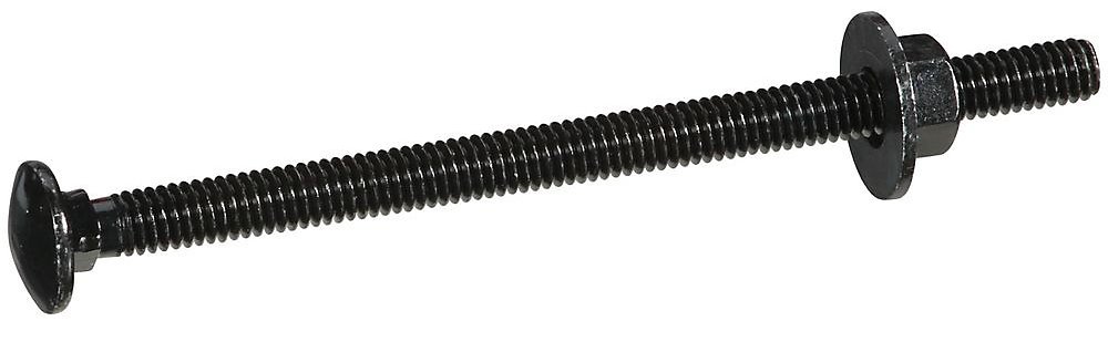 The STANLEY National N179-176 is a 5/16" x 5" carriage bolt, manufactured from durable steel and finished with a zinc plating and satin black paint. This fastener is specifically designed for use with National's 858 Heavy-Duty Ornamental Strap Hinge and 859 Heavy Duty Ornamental T-Hinge, providing a secure and aesthetically matching connection.