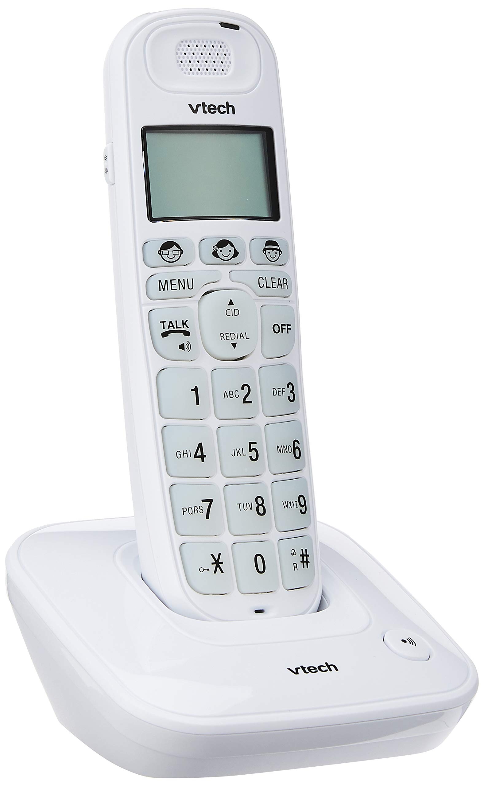 Image: Close-up of the VTech VT1091 handset, highlighting the large backlit keypad, LCD display, and dedicated function buttons.