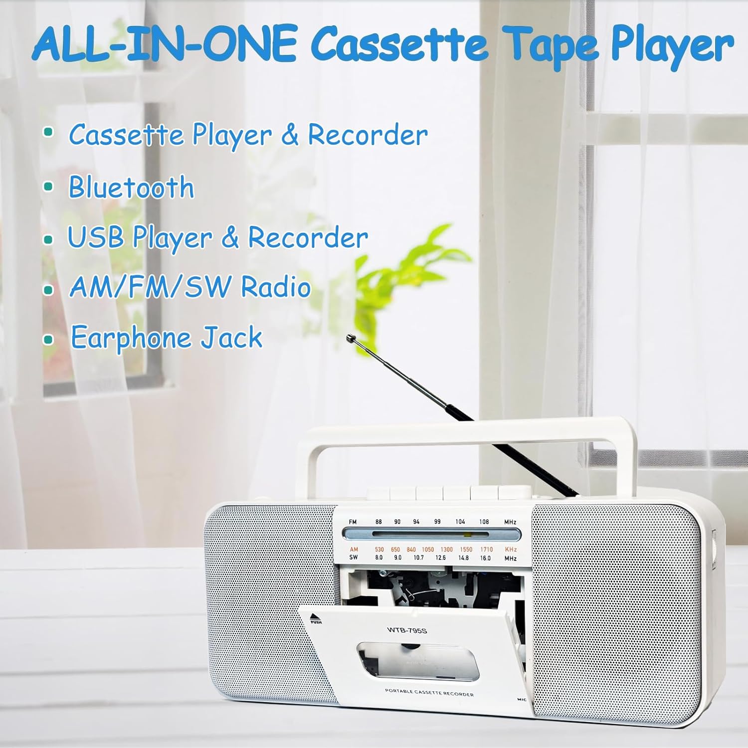 - Cassette Player & Recorder: Play your favorite cassette tapes and record audio from the built-in microphone, external sources, or radio directly to cassette.