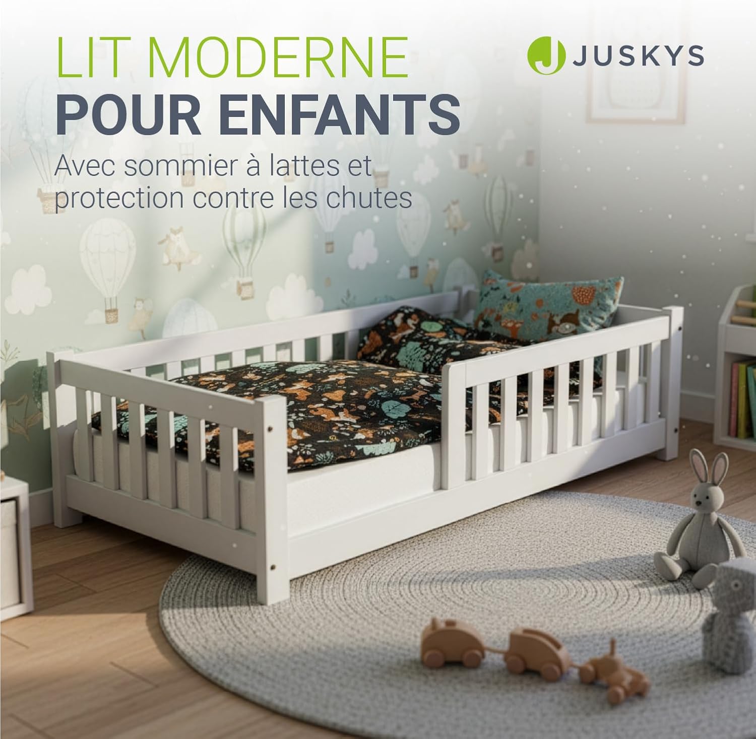 Image: The Juskys Naya floor bed featuring a safety barrier with rounded edges, designed for a secure sleeping area.