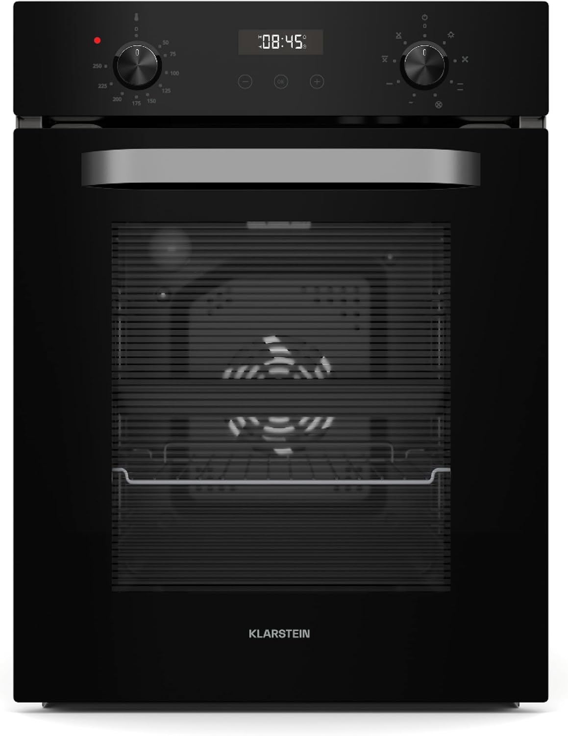 مخکی view of the Klarstein SmartSlim 45 cm built-in oven, showcasing its sleek black tempered glass design and control panel.