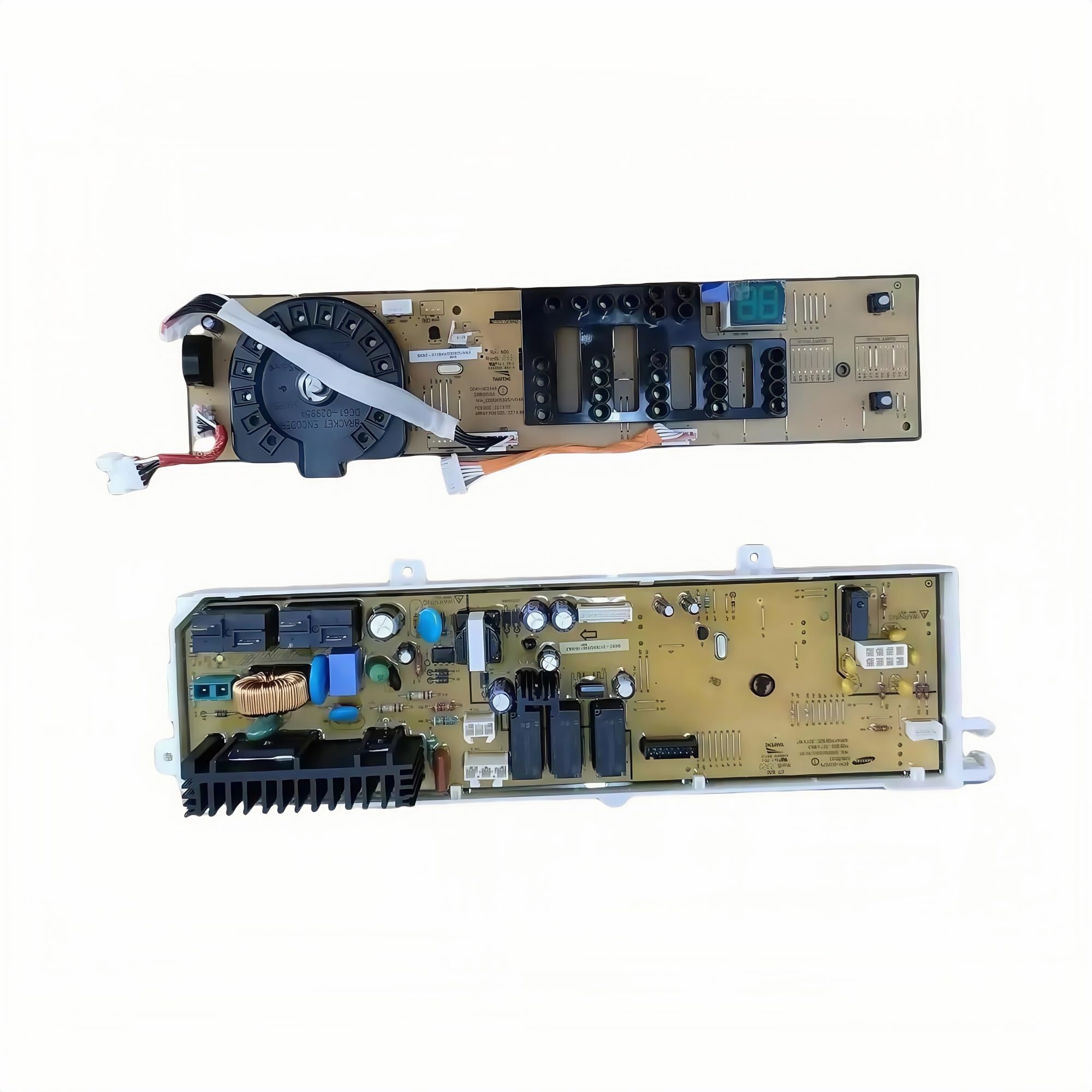 This image displays the main control board (top) and the user interface control board (bottom) for a Samsung washing machine. The top board features power components, relays, and a heatsink, while the bottom board includes an encoder dial, various buttons, and a digital display showing '88'.