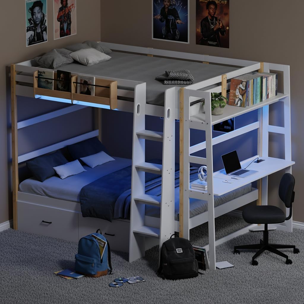 | ځانګړي ځانګړتیاوې | LED Lighting, Convertible Desk, Storage Drawers, Angled Ladder |